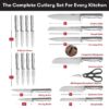 – Unleash your culinary creativity with a comprehensive selection of knives, including an 8-inch chef’s knife, 3.5-inch paring knife, 7-inch santoku knife, 8-inch carving knife, 5-inch utility knife, and an 8-inch serrated bread knife.