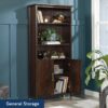 During the same decade that Art Deco style was popularized in the United States, a new furniture company was taking shape in a barn behind a rural American homestead. The 1934 collection, named to commemorate the founding year of the Sauder furniture company, depicts the beauty and grace of a bygone era. This elegant 5-shelf bookcase has three adjustable shelves for versatile storage possibilities, from antique books to an elegant art deco vase. Behind the two cabinet doors of this tall bookshelf lies hidden space for storage of seasonal décor, audio visual equipment, and much more. Assembly of this bookcase with doors is made easier thanks to the convenience of a slide-on molding. Retro metal leg caps in antique bronze coordinate with the art deco-inspired geometric hardware to give this library bookcase with doors a pop of vintage charm. Whether you’re looking to add a touch of retro glamour, or you have an appreciation for a creative Art Deco aesthetic, the elegant look of a dark, Deco Cherry finish gives this library bookcase an enduring impression in any home.