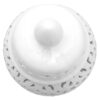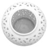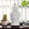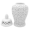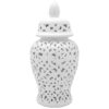 Striking pierced open spiral lattice Oriental design lidded temple jar in a fine clear hard gloss finish over a solid white glaze. Displayed singularly or in pairs, this home decor accent is perfect for traditional or modern interior designs.