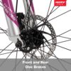 This beautiful silver bike with pink detailing is sure to allow for many adventures and the dual disc brakes give you great control for smooth braking. Hop on the comfortable seat with a quick-release binder, you’ve got a great ride on the horizon.