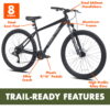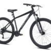 The 27.5″ Ozark Trail Vibe mountain bike hits the sweet spot with its capability, versatility, and affordability. Sporting a lightweight aluminum frame with a specially tapered headtube, this mountain bike is designed specifically for your trail-riding needs. The dual mechanical disc brakes give substantial stopping power during normal trail riding and deep descents. Knobby MTB tires and a front suspension fork let you tackle tougher terrain with ease. Quickly and smoothly transition through the 8 gears with the handlebar-mounted trigger shifters as you tear up the trail. Adjustability is key for a proper fit, so this unisex adult bike offers 3 distinct frame sizes all with adjustable saddle heights.
