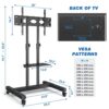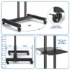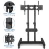 The rolling TV stand features 32″, 34″, 35″, 38″, 39″, 40″, 42″, 43″, 45″, 48″, 49″, 50″, 53″, 54″, 55″, 58″, 59″, 60″, 64″, 65-Inch flat curved-screen TVs, made of sturdy high-grade steel, making them suitable for withstanding high traffic environments. Besides, the rolling TV cart features an attractive black finish that blends with any decor. Modern floor metal TV cartwheels can be used in commercials or communities to present upcoming events, festivals, or other important information. This is also true for living rooms, homes, or educational institutions. Features shelving to carry electronics like laptops and tablets. Moreover, the shelves can be adjusted for extra convenience.