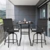 Looking for cozy outdoor bistro stools Look no further than this Quick-drying Foam-padded Outdoor Bar Stool set! Made with breathable texteline fabric, this all-weather bistro stool set will keep you cool and relaxed even on the hottest summer days. Say goodbye to sweaty seats and hello to relaxation! With a 360° rotary seat feature, you can effortlessly turn and chat with friends without constantly readjusting your position. The natural brown tone/ classic black/ fresh gray seat and sleek black frame give these stools a minimalist yet stylish look that will effortlessly blend into any outdoor setting. Enjoy generous sitting space with a cool seat, high backrest, and smooth armrests designed for optimal comfort and support. The sturdy iron frame and stable structure ensure durability and safety, with each chair capable of holding up to 286 lb.