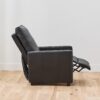 - Black leather upholstery covers the delightful cushions to create a reclining leather chair that is comfortable for lounging in