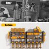 – Extra Large Capacity Design This wall-mounted power tool organizer uses 4-tier high-capacity design. The bottom layer can store 8 cordless drills, the upper 3 layers can store other heavy tools or various small tools, and a hammer holder, pliers holder and screwdriver holder are added to the side.