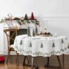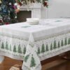 The Avanti Trees holiday tablecloth features festive pine trees in the center and full border of trees with pine branches on a textured off-white ground.