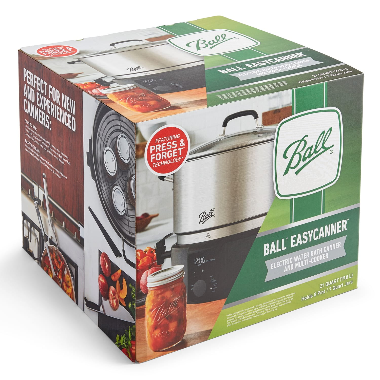 Free up time and space on the stovetop with the Ball EasyCanner. Just fill the freestanding canning pot with water and jars of your favorite canning recipes, set the timer, and relax as it takes care of the rest. The pre-programmed Press & Forget technology automates preheating and processing steps with heat sensors that maintain optimal temperatures for consistent results every time while eliminating the time-consuming need to watch the pot.* The 21-quart capacity fits up to 8 pint-size or 7 quart-size jars. When finished, use the spigot for mess-free draining into your sink, and add the lid, rack, and steam tray to the dishwasher for easy cleaning; pot is hand-wash only. Comfortable handles make it easy to lift and tuck away when not in use. Plus, canner includes multicooker and steamer functionality that’s perfect for cooking pastas, soups, vegetables, and seafood, making it the essential all-in-one tool for new and experienced canners alike. *Do not leave appliance unattended.