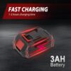 3.0 Hour Battery and Fast Charger Our rechargeable impact wrench comes with a 3.0Ah lithium-ion battery and fast charger. LED real-time power indicator and fast charger. Compared with other 2.0Ah batteries, 3.0A batteries have a large capacity and longer life, which far exceeds their working time, and can keep the wrench running continuously, ensuring that you can keep the tool’s power sufficient at any time and anywhere to keep the work continuing.