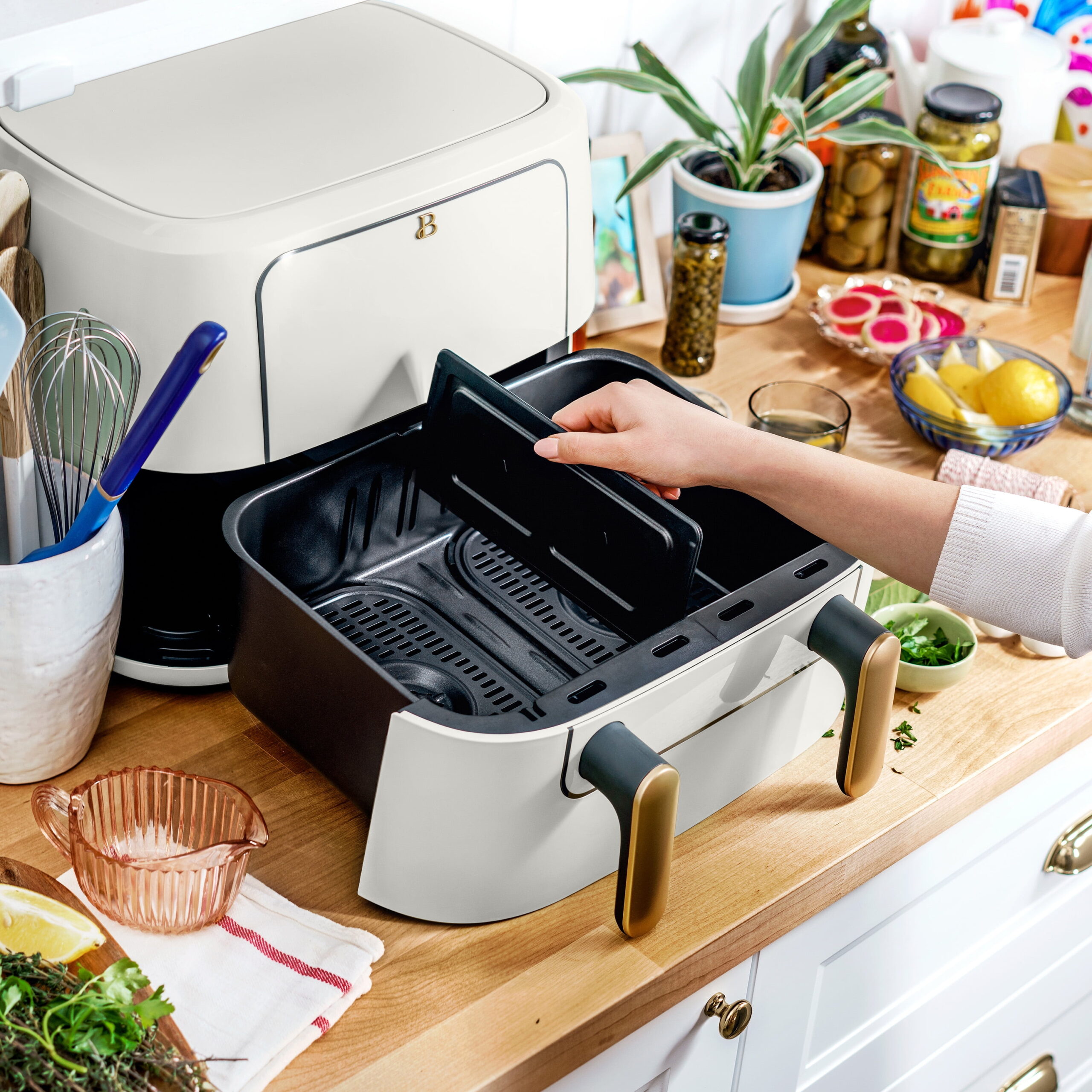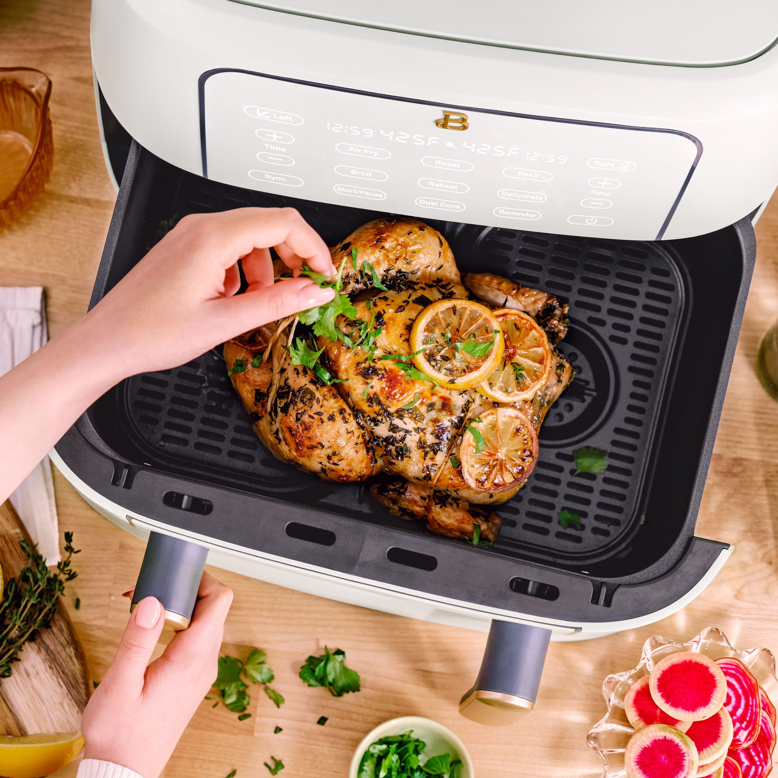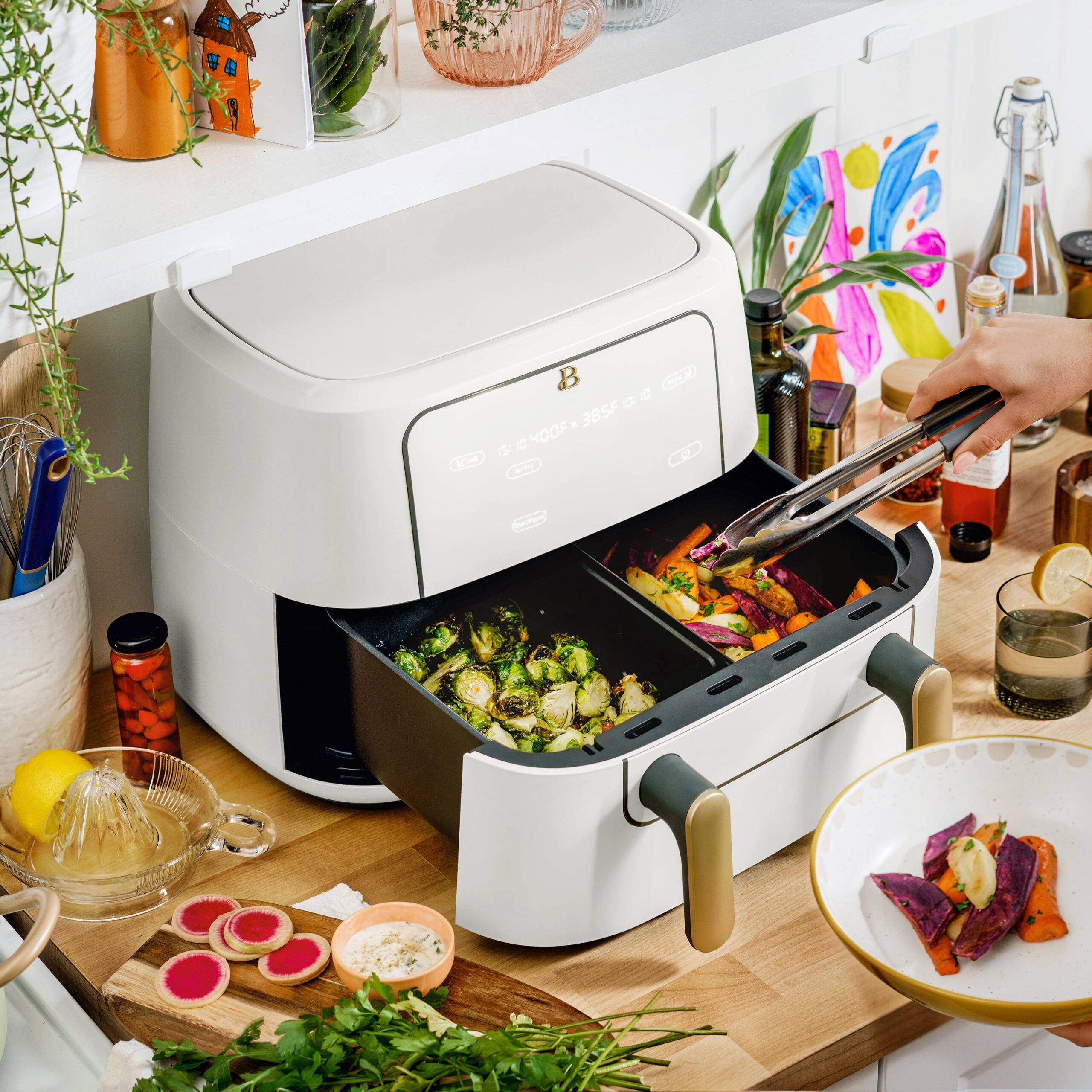 The most diverse Air Fryer on the market. The Beautiful 9 Qt TriZone Air Fryer lets you cook two foods in different ways simultaneously with separate 4.5qt baskets or remove the divider to prepare a larger meal. For different cooking times, program each item to finish together. Air fry, roast, reheat, dehydrate, bake, or broil with ease using the touch-activated display. Created by Drew Barrymore, Beautiful Kitchenware® combines elegant design, contemporary colors, and modern silhouettes for high-performance appliances that look beautiful on your kitchen counter.