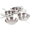 – Set includes 9.5″ frypan, 8″ 3.2-qt. Saucepan, 9.5″ 5.5-qt. Stockpot, 9.5″ Deep Skillet with helper handle, and 3 glass lids, featuring long ergonomically designed comfort-grip handles and mirror finish