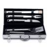 – Small brush, barbecue knife, slotted turner, meat fork, tongs & aluminum carrying case.
