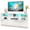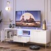 The Bestier Modern High gloss Fluted TV Stand with LED Light is a stylish and multifunctional addition to any living room, bedroom, or office. This chic LED TV stand, with its fluted door panels, high-gloss finish, and gold accents, offers a contemporary aesthetic that complements any decor. Designed to accommodate TVs up to 60 inches, this modern entertainment center features a large drawer, two enclosed cabinets, and an open shelf equipped with remote-controlled LED strip lights. Constructed from premium PB board and a sturdy metal frame, this 55 inch TV console ensures durability and easy maintenance. The high gloss TV cabinet also includes 6 adjustable foot pads for enhanced stability and floor protection. Although assembly is required, the package includes detailed instructions and all necessary tools for a hassle-free setup. The assembled dimensions of this LED entertainment center are 21″H x 55″W x 14″D.
