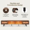 Bestier mid-century modern TV stand with LED light, engineered with premium waterproof cellular board and reinforced solid wood legs, offers a perfect blend of strength, style, and functionality. It can effortlessly accommodate TVs up to 75 inches and has a robust capacity of 230 lbs. The built-in LED light with 7 colors and 22 modes adds a dynamic touch to your entertainment space. The LED entertainment center highlighted by 2 sliding glass doors, blends effortlessly with any decor. It also features a 70″ x 16″ tabletop, 2 open and 2 closed storage for efficient organization. The rear of the media TV console table includes 4 cable holes for tidy wire management. This 70″ entertainment center with storage is easy to assemble and suitable for living rooms and bedrooms. Once assembled, the 70″ TV stand for TVs up to 75″ with sliding glass doors measures 15.9″H x 70.1″W x 15.6″D.