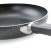 This aluminum fry pan is ideal for frying, scrambling, sautéing and searing. Curved walls allow for easy stirring and prevent steam from forming in pan. Professional quality, heavy-duty aluminum body distributes heat evenly. Aluminum handle has large hole for easy storage.