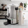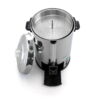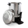 Brew delicious coffee day after day. This 100 cup coffee urn is perfect for catering and gatherings as well as school, church and office functions. Coffee Urn is easy to use with it’s ready/keep warm and brewing indicator lights and keeps coffee warm and fresh for hours. Features plastic handles that stay cool, see through fill line, reusable coffee basket and drip tray.
