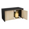 – The base of the fire pit features a convenient storage compartment that opens to house the 20 LB propane tank.
