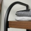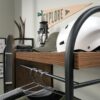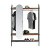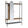 Is lack of closet space bringing you down We can change that! Create the versatile storage space you need while adding sleek style and design to your bedroom with this hanging wardrobe from the Boulevard Cafe collection. This wall-mounted storage solution features a sturdy metal rod and two hooks so you can easily store and hang items like your button-up shirts, dress slacks, jackets and so much more. Behind the mirrored door is a hidden storage area that includes three adjustable shelves that can move to different heights to create flexible storage of items of all shapes and sizes. Additional storage includes three fixed shelves for other miscellaneous items. This wall wardrobe also includes a perforated lower shelf that adds visual interest and makes a convenient place to store your collection of shoes. This hanging armoire features a powder coated metal frame for added durability that is sure to last. Finished in black with Vintage Oak accents, this one-of-a-kind hanging wardrobe is just what your bedroom needs.