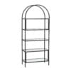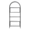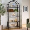 Introduce a distinct touch of style to any home décor with the bookcase from the Better Homes and Gardens Nola collection. This modern, open shelving unit boasts five fixed shelves, each featuring safety-tempered glass. The glass shelves provide an ideal showcase for displaying lush, green plants, family photos and more. Not just a display unit, this open storage bookcase serves as a practical solution for organizing a living space. Utilize the shelves to store a prized collection or other essential items, maintaining a clutter-free environment that enhances the setting. With its rounded top design and commanding height, this modern shelving unit makes a striking statement, capturing attention the moment guests enter the room. Adjustable levelers stabilize this open shelving bookcase, even if the floor is not level. Finished in sleek black and constructed with a durable, metal frame, this visually pleasing contemporary bookcase with glass shelves effortlessly adds a touch of class and elegance to any home décor.