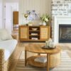 Featuring a warm, Light Honey finish, with side panels made of a palm-inspired rattan insert, this round coffee table from the Better Homes & Gardens Springwood Collection encompasses a tropical aesthetic with old-world charm. The surface of this modern coffee table provides ample room to store and display an array of items, such as stacks of books, the TV remote, a big bowl of snacks or an ice-cold beverage. The bottom shelf is the perfect place for stacks of magazines, board games, or to stash away a basket of craft supplies. This coffee table with rattan is embellished on both curved sides. These natural fibers are on-trend, giving an artisanal charm and trendy look to your living space. This coffee table with open storage is finished on all sides for versatile placement throughout any room in your home. This open shelf coffee table provides plenty of space for both storage and display. Give your home a modern silhouette that blends sophistication and function to any setting.