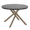 – 40″ round outdoor dining table features decorative legs and a metal embossed tabletop