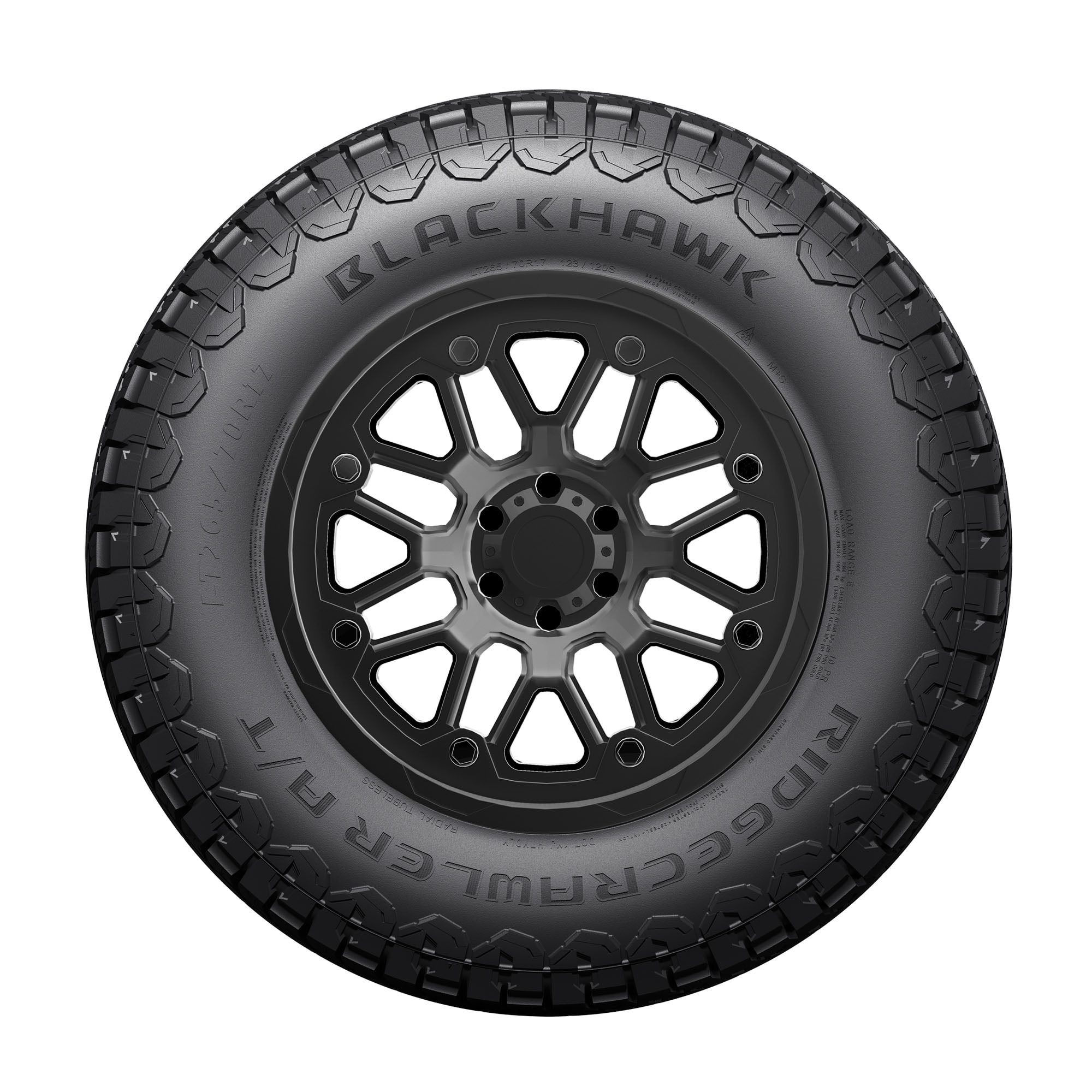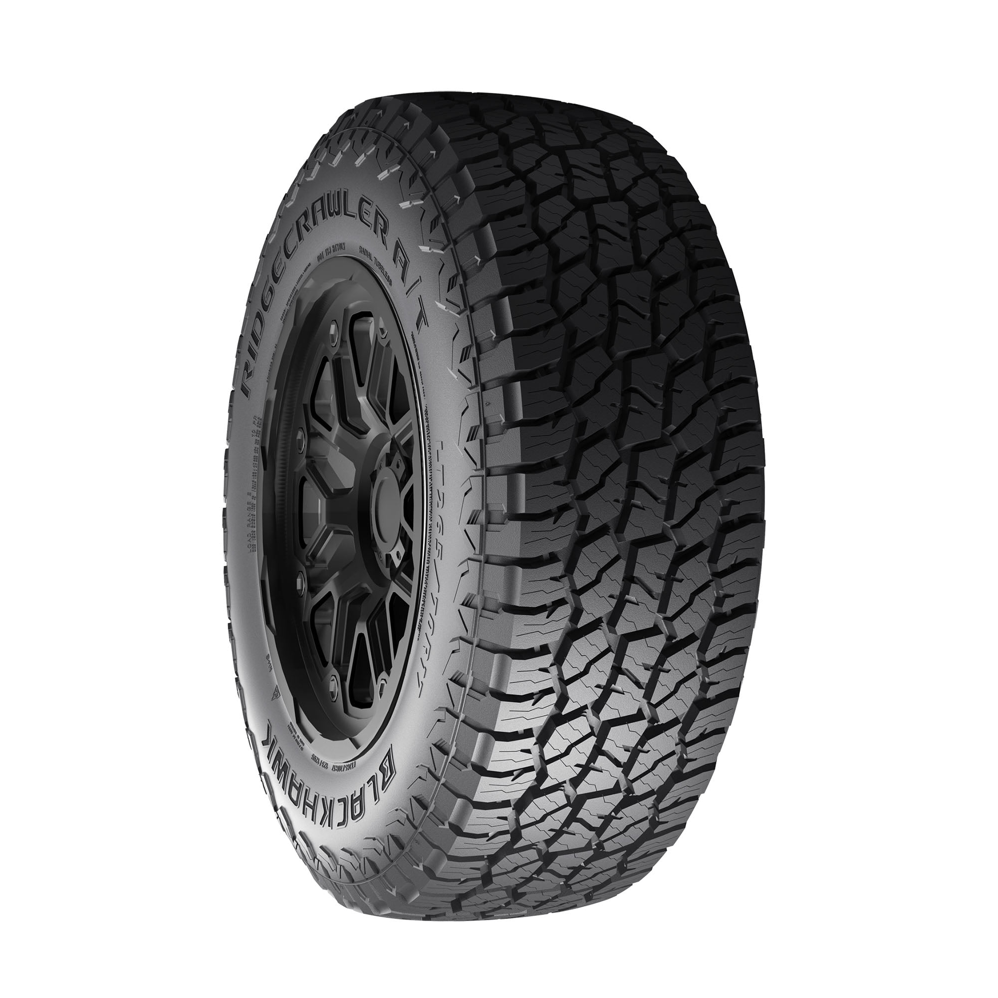 The BlackHawk Ridgecrawler A/T is a rugged and versatile all-terrain tire engineered for reliable performance across diverse conditions. Its aggressive deep lugs and staggered shoulder blocks provide exceptional grip, earning it the Three Peak Mountain Snowflake rating for severe winter service. With a wide footprint and reinforced shoulders, the Ridgecrawler A/T delivers stability, while its tread pitch, optimized through Finite Element Analysis, ensures a quieter ride. Backed by a 50,000 mile limited manufacturer tread life warranty, this tire offers durability and comfort for both on-road and off-road adventures.