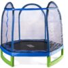 Keep little ones entertained and active in the backyard with the Bounce Pro My First Trampoline in blue and green. Designed with fun, quality and safety in mind, it features a three-arch netted safety enclosure that keeps children contained as they play while providing parents with unrestricted visibility. This kid’s trampoline also includes a padded spring cover and a UV-resistant jump mat sewn together to prevent any unwanted contact with the springs. Blow-molded plastic U-legs maintain balance and stability while foam padding on the frame poles provides an additional layer of safety. The galvanized steel frame stands up to the elements and resists rust. Kids can enter and exit easily through the zippered opening. The Bounce Pro 7′ My First trampoline is easy to assemble, offering convenience and saving time.