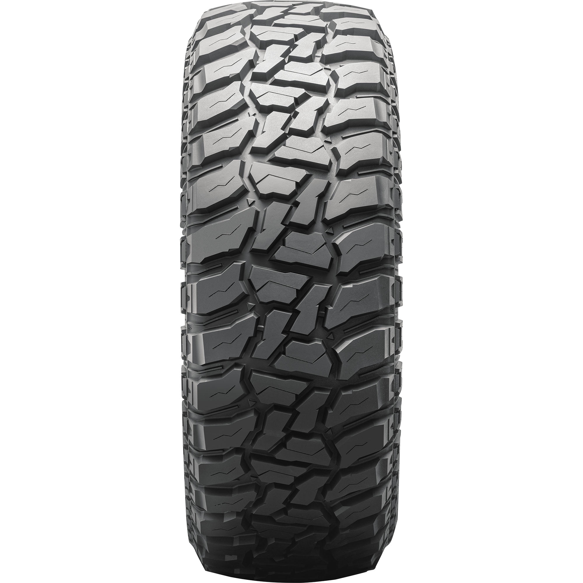 - Aggressive mud-terrain tread with angled biting edges, sipes, and stone ejectors