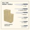 - Knives store upright in block to save space, and larger knives slide out sideways for easy access