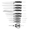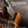 – 8-in. chef knife, 8-in. slicing knife, 7-in. Santoku knife, 7-in. serrated bread knife, 5.5-in. utility knife, 5-in. boning knife, 3.5-in. paring knife, 3-in. peeler knife, eight 4.5-in. steak knives, kitchen shears with opener, acacia wood block with built-in sharpener
