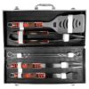 – Includes: carrying case, 4 skewers, spatula with bottle opener and serrated knife edge, basting brush, tongs and a fork