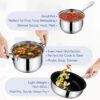 The stainless steel kitchen cooking set has riveted stainless steel handles, which are professionally riveted to ensure a lifetime of prefect balance, Further, these stainless steel cool grip stick handles are durable, comfortable, wide and deep, which are contoured for a secure grip and designed to stay cool on the stovetop, The perforated handle of the saucepan is designed for easy hanging and saves space in the kitchen