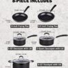 The Cook N Home 8-Piece Nonstick Heavy Gauge Cookware Set includes: 1-quart saucepan with lid. 2-quart saucepan with lid. 6-quart stockpot with lid8 inch fry pans. 9.5-inch fry pan. Made of thick gauge aluminum that provides even/quick heat conduction and prevents hot spots. Nonstick makes food release/cleaning easy and allows for healthy cooking. Riveted handles are comfortable and stay cool with a hole for hanging. Tempered glass lids with steam vent to view cooking and fits on fry pans. Works on gas, electric, glass, ceramic, halogen, etc. Induction compatible, Oven safe to 400F, the glass lid to 350F. Dishwasher safe.