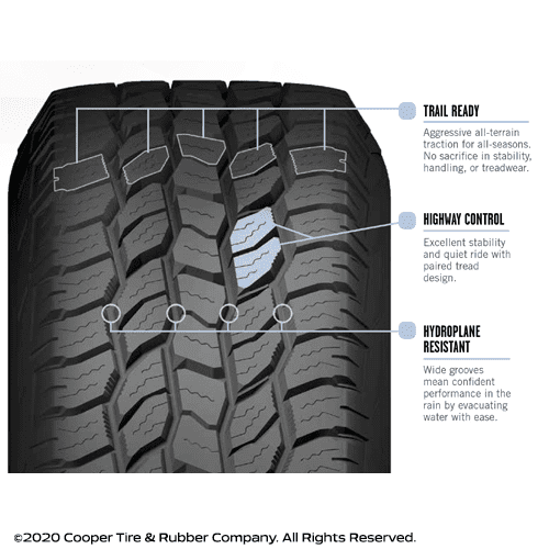 Enjoy your time behind the wheel when you are equipped with the Cooper Discoverer A/T All-Season LT265/70R17 121S Tire 60,000. It is designed to deliver a smooth experience on the highway and off. This all-season performance tire is made for owners of pickup trucks. Plus, it does well on both wet and dry conditions. This all-terrain tire is suited to tackle gravel and rocky ground when you go off-road.