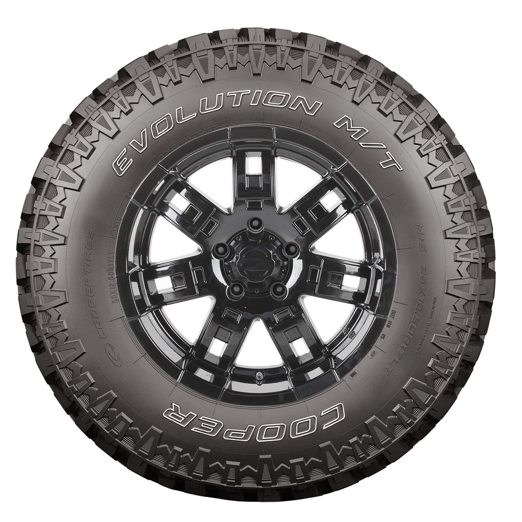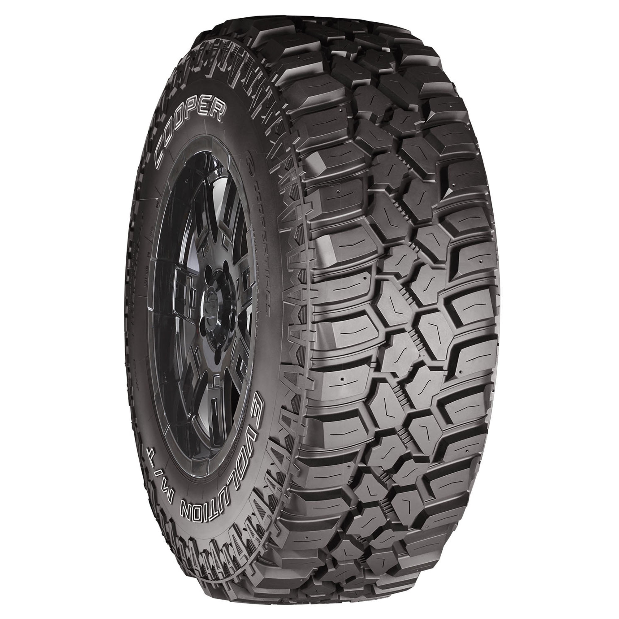 When the road ends and the mud begins, the Cooper Evolution M/T tire is engineered to get light trucks and SUVs through it with confidence. The Evolution M/T’s mud-terrain tread pattern features oversize lugs and Cooper’s Mud Slingers to eject rocks and mud, while a reinforced sidewall and innovative shoulder design provide lateral traction . Additionally, the Evolution M/T is M+S rated for mud and snow traction.