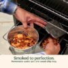 – Removable water pan retains food moisture and the wood chip box with a lid adds flavor to your food