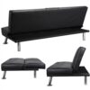 Looking for the perfect anchor piece for your living room Complete your space with the futon! This sofa bed is made of high quality artificial leather with a sturdy iron frame. The durable materials guarantee that this futon will last a long time. This home recliner couch can be transformed into a quick guest bed for visitors by removing the armrests and reclining the back rest. This futon is designed for comfort with ergonomic materials and a middle armrest that folds down with two cup holders. Find a friend to relax and enjoy a cold beverage with! This sofa bed is ideal for small spaces, and well-suited for an apartment, studio, dorm room, living room, bedroom, etc. The modern yet transitional design makes it blends perfectly with any home decor style. Simple assembly is required and detailed instructions are included.