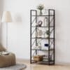 – VERSATILE SHELVING: Featuring five open shelves and a sturdy framework, this bookcase boasts ample storage space, allowing you to showcase your treasures in any angle. Ideal for organizing books, family photos, potted plants, CDs, ornaments, and more.DURABLE AND BEAUTIFUL: Created with wrought iron with a matte black finish. The smart combination of sturdy boards and a metal frame make it a standout piece. Its innovative design, featuring metal sidebars with X-shaped rods at the rear, ensures unwavering stability.