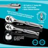 – 90-Tooth Ratchet – One button quick release 90-tooth ratchet mechanism design provides a 4-degree arc swing, perfect for tight spaces, secures the socket into place and releases quickly.