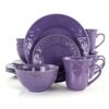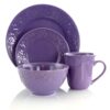 The Elama Lilac Fields 16-Piece Stoneware Dinnerware Set sets the scene for effortlessly stylish weeknight dinners and family get-together with its embossed design. Start with a cottage-chic or traditional table, then add a handsome sideboard and elegant upholstered chairs to give the space a timeless, inviting feel. the soothing lavender color of the plates gives it a delicate inviting feel.