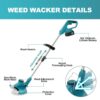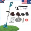 Weed & Brush Cutter 3-in-1 Cordless weed eater comes with 3 types blades(8″ cutting width): One word stainless steel blade for cutting thick weed and small shrubs. 8 inch saw disc for cutting thicker shrub, branches, sapling . Plastic rope are suitable for mowing soft grass and other light stuff. Please notice that Plastic rope are not suitable for mow thick shrub branches. You can trim edges on sloping terrain and reach hard-to-reach places with this trimmer. Made of high-quality materials, it is durable with high power.