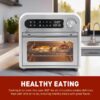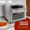 – Digital LED display with preset functions: French fries, fish, steak, chicken, pizza, bread, cake, vegetable, warm, rotisserie and dehydrat