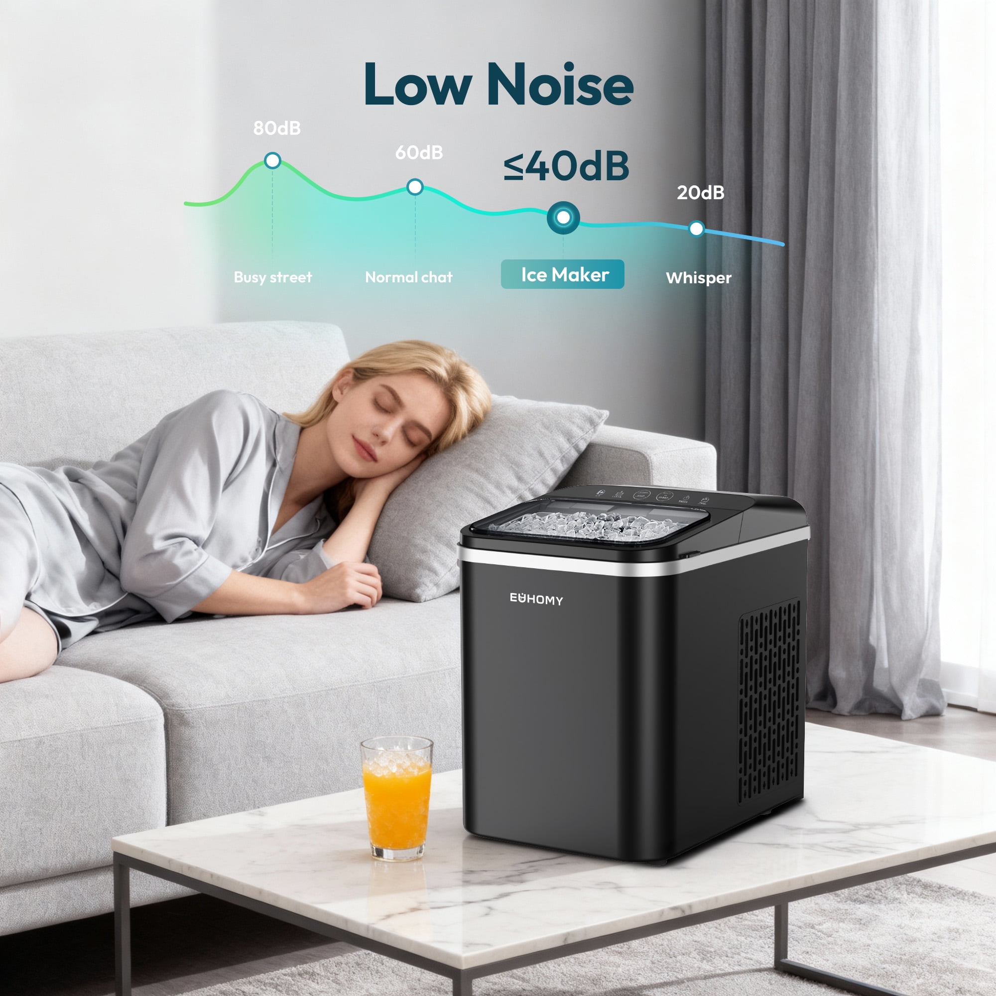 Enjoy ice without the noise. Running under 40 dB, this nugget ice maker is quieter than everyday conversation—ideal for open kitchens, offices, or shared apartments. Advanced compressor technology not only maintains fast ice output but also reduces energy consumption, saving you money over time. ETL certified for safety, it combines professional-grade performance with eco-friendly efficiency. Backed by EUHOMY’s trusted customer support, it’s a smart, reliable upgrade for your home or workplace.