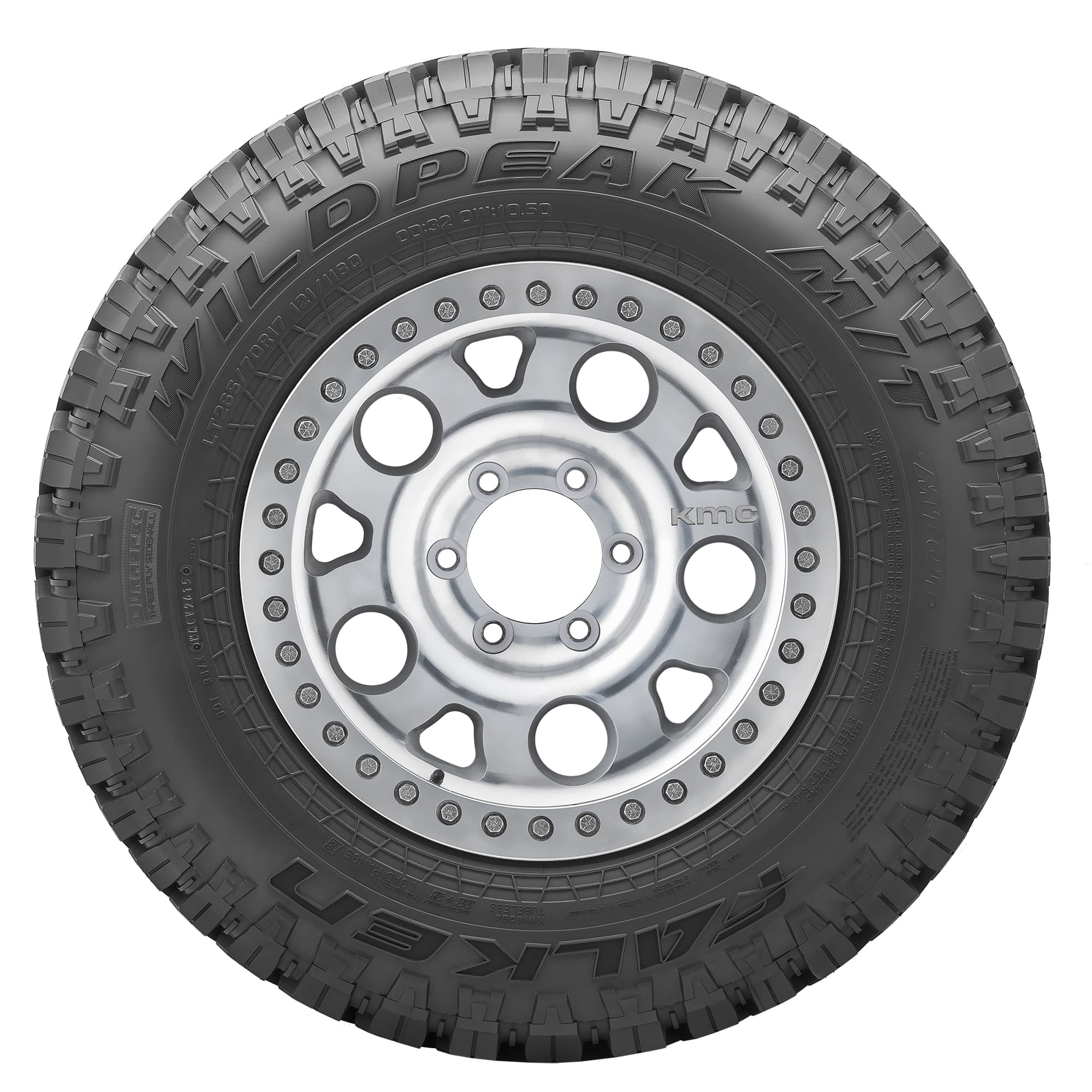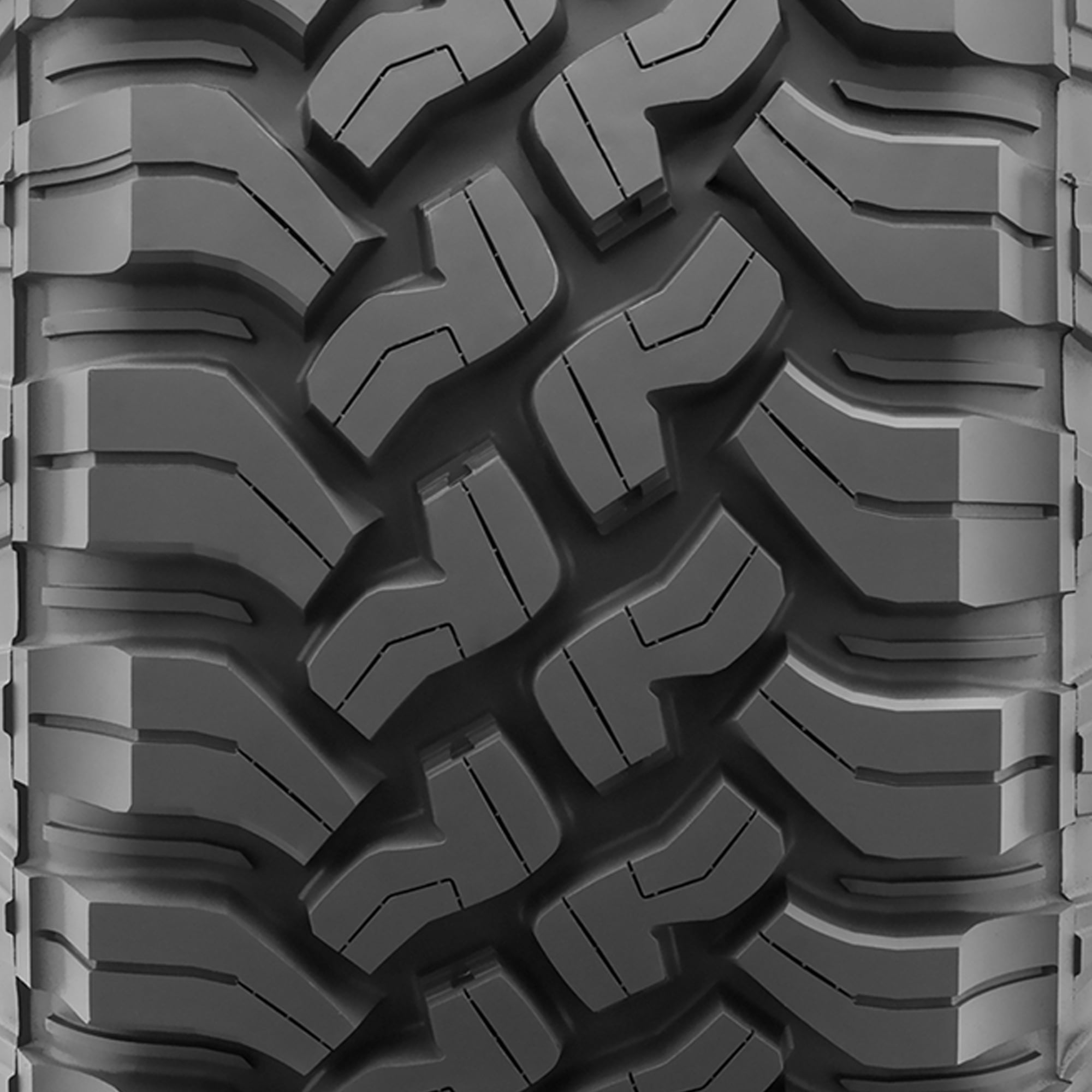 - Aggressive mud-terrain tread with step-down supports at center and built-in stone ejectors for extra traction and durability when driving off-road