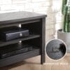 The black wood grain and simple lines on this tv stand make it look classic and elegant. It can be not only used as televison stands, also perfect for sofa table, entertainment center, media stand, storage console table, tv console etc. This TV stand is perfect for TVs up to 65 inch TV.4 open shelves with big capacity allow you to storage the books, magazines, CDs and any other media or gaming devices. The media console table made of high quality MDF which is durable and sturdy enough to be used for a long time. Plus, four wooden legs further enhance stability, preventing the TV stand from wobbling. Max load capacity: 175 lbs. The black entertainmen center for 65 inch tv with smooth surface is waterproof and easy to keep clean with a damp cloth. The tv table is 3.9 in high height off the ground which adequate for robot vacuum cleaner can passing freely. No more headaches from dust under the cabinet.