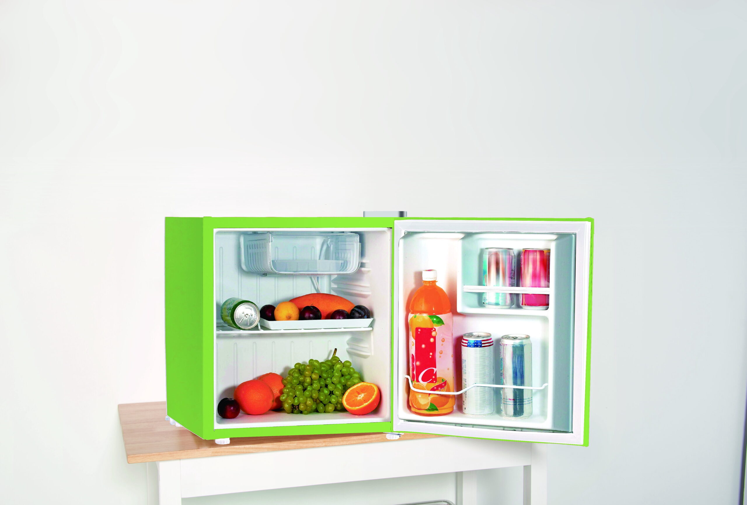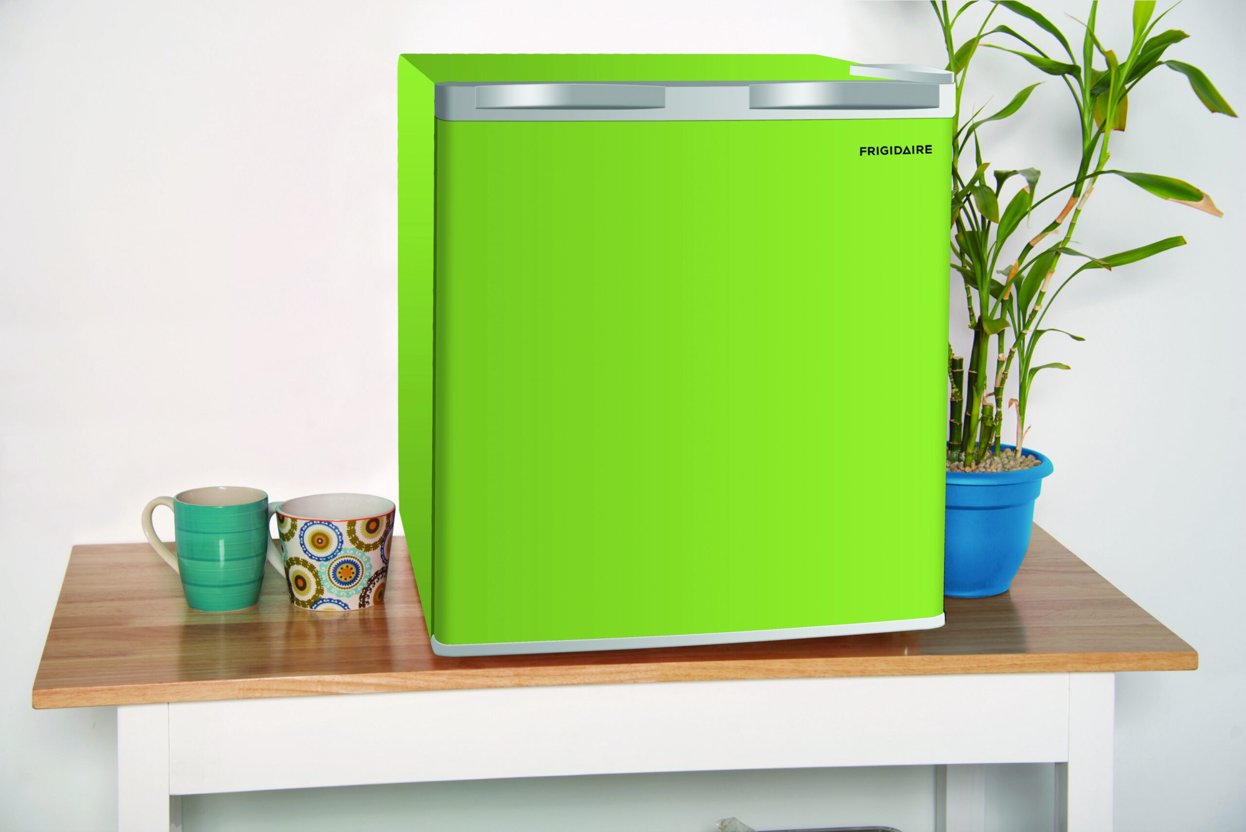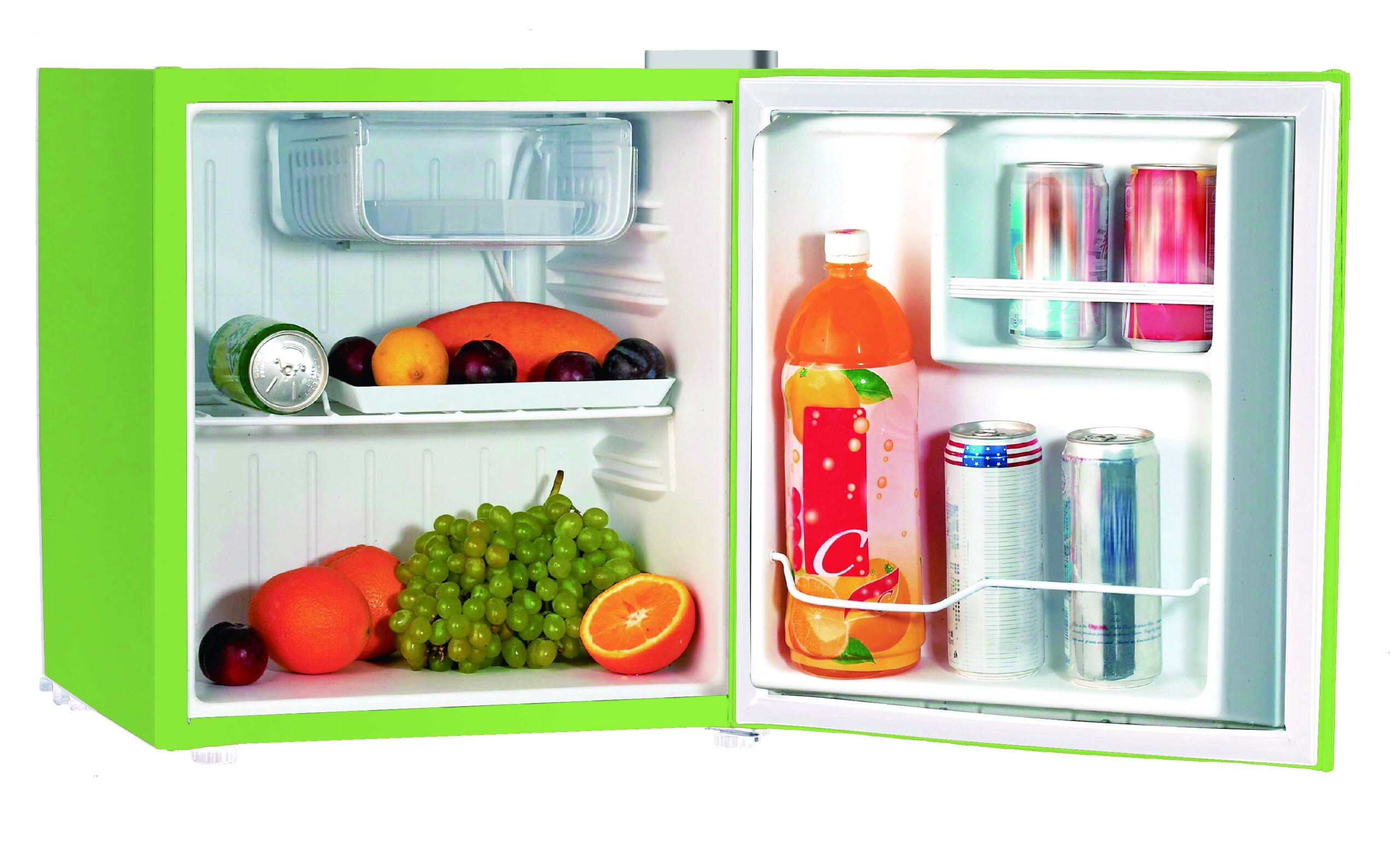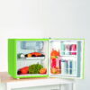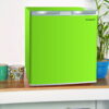 The Frigidaire green 1.6 cu-ft. Mini Fridge is roomy enough for your groceries but small and sleek enough to fit almost anywhere. The convenient door basket on the reversible door is large enough for 2L bottles, canned drinks and other items. The door can be conveniently set to open from the left or right side to fit your needs. It is ideal for a college dorm, bedroom, office or any place you need a compact fridge to keep your food and beverages handy and cold. This reversible door refrigerator has an ice cube tray, adjustable thermostat, and an invisible door handle. With its space-saving design you can safely and conveniently place this Frigidaire 1.6-cu.-ft. Refrigerator in any spot.