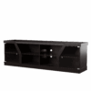 Enhance your home’s sleek entertainment room by adding this contemporary TV console into the mix! A pair of cabinets on either side of the piece feature a beautiful glass pane that is accented by the sophisticated trim along its edge. Each cabinet houses two shelves perfect for displaying decorations or movies for easy viewing while another set of centered open shelves offer room and easy wire access holes for media devices. Supported atop a flat and sturdy base, this espresso finished piece adds sleek style to revitalize your home’s decor.
