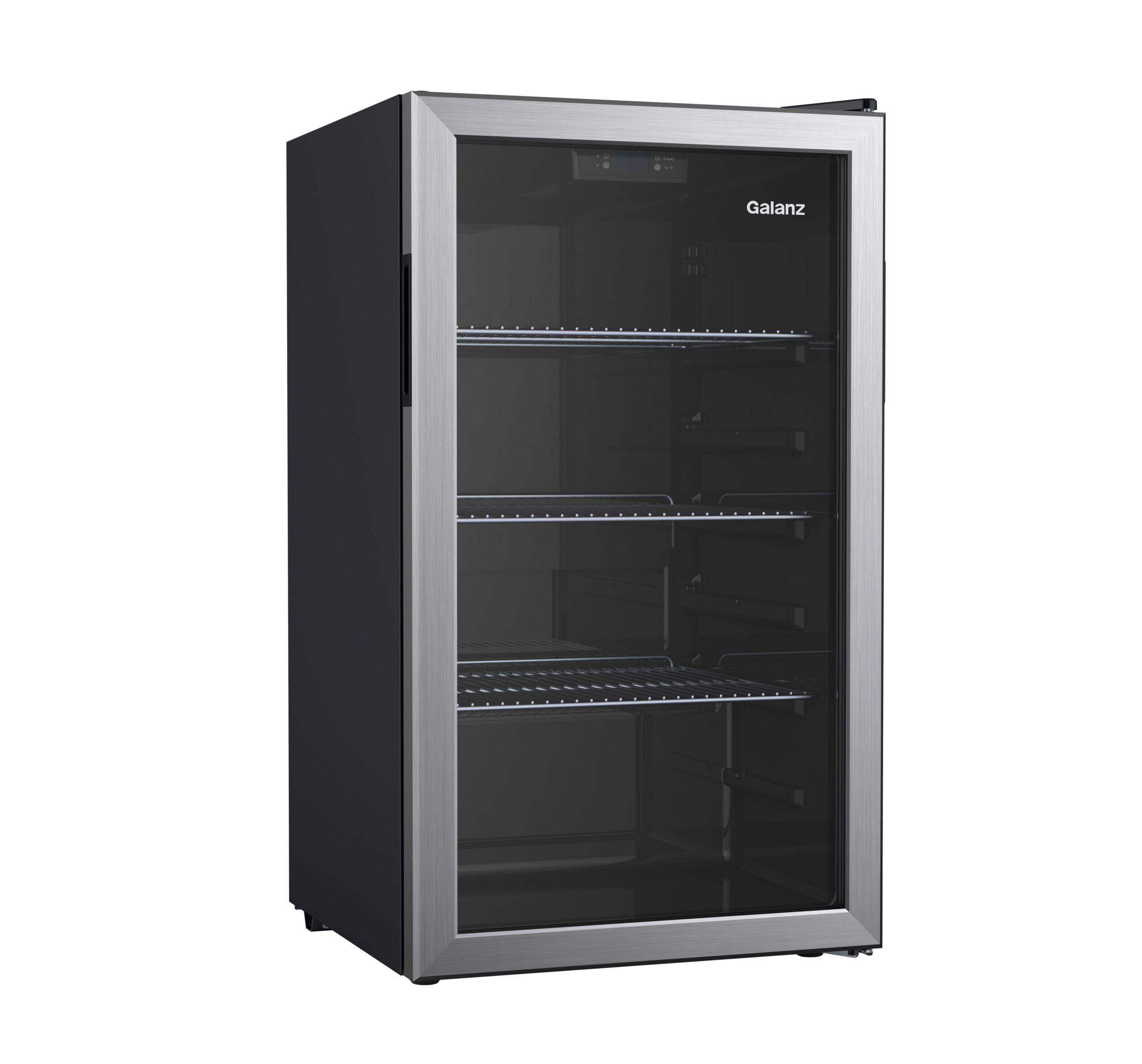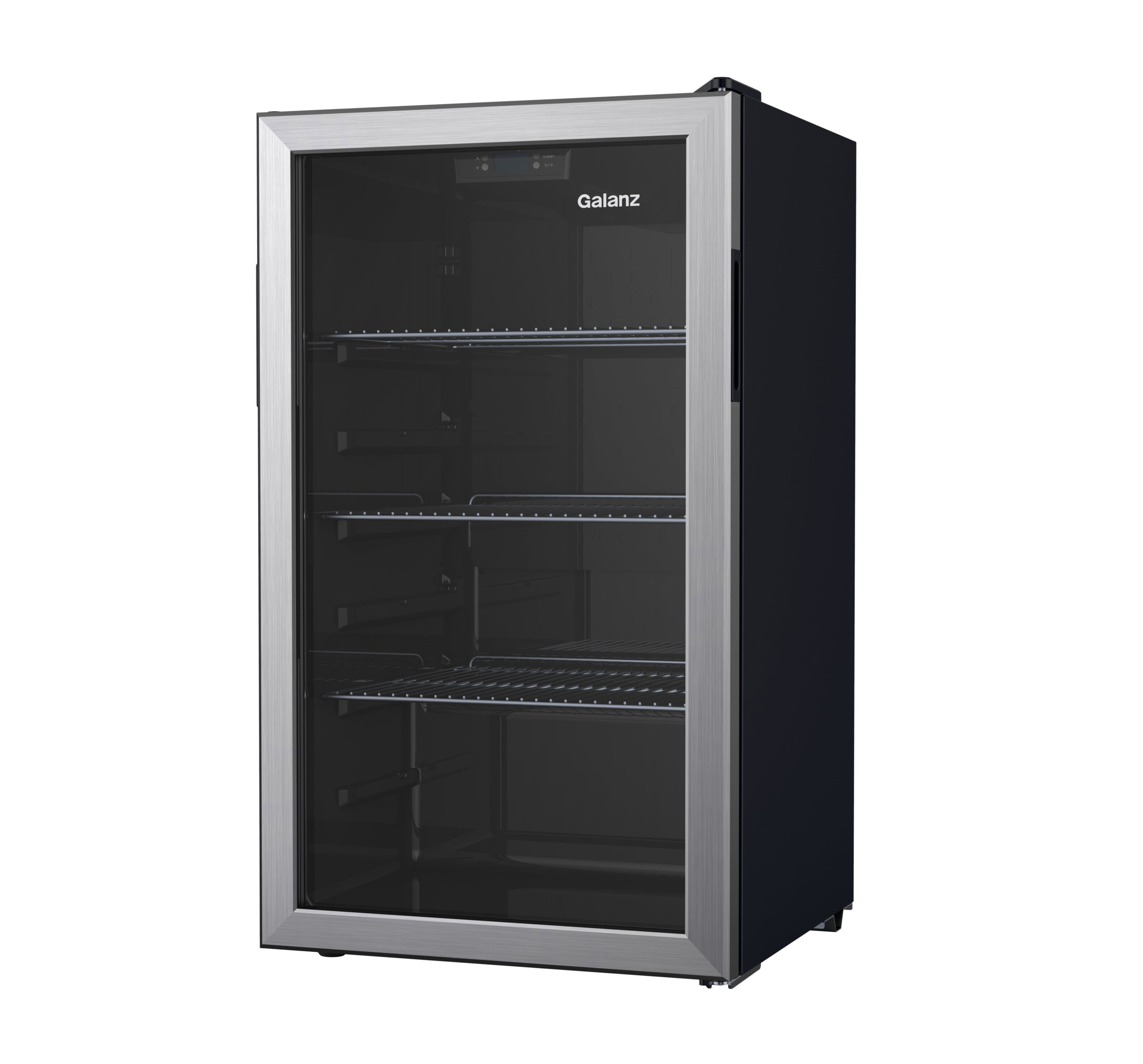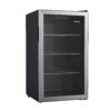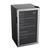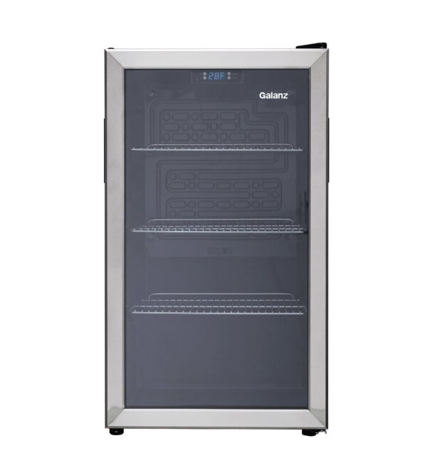 The Galanz 3.6 Cu ft 116 can Beverage Mini Fridge with its stainless-steel door frame and reversible door will enrich your kitchen, rec room or home office with style. This thoughtfully engineered digital beverage center allows you to adjust the temperature between 32°F and 61°F to keep beverages and refreshments cool. LED interior lighting and the see through glass door with 3 layers can reduce heat transference and block ultraviolet rays and makes what you are looking for easy to find. Adjustable sliding wire shelves ensure classy storage space with easy access. Condition: New, Stock Number: GLB36S2CS.