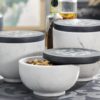 Our new metal-inlay collection is washed with a translucent stain to create beautiful dark gray tones that compliment all neutrals, woods and decors. Our white-with-neutral tones marble small canister with lid can be used in any room of the home – it is food safe for the kitchen, and also looks lovely in the office or bath for organization.