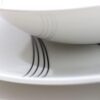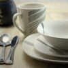 This Gibson Curvation 16-Piece Soft Square Dinnerware set is decorated with a bold, modern black linear design on a white background. The rounded square shape complements the modern motif. This quality fine china will enhance your table while it gives you long lasting beauty. This Curvation set is perfect for everyday or special occasion dining. This set is perfect for your everyday use or when you have people over. The set is complete for 4 people. The set includes: Four Dinner plates 9.5 x 9.5 x 0.75 – 1.10lbs Four Salad Plate 7.25 x 7.25 x 0.50 – .13oz Four Bowl 7 x 7 x 2 – 0.13oz Four Mugs 4.75 x 4 x 3.5 – 0.11oz The dishes are microwave safe They are also dishwasher safe