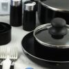 The Total Kitchen 59-Piece Combo Set celebrates comfort and contemporary style. This complete set features every kitchen essentials you will ever need. Every piece of this set is made with high quality material that will withstand time and wear. Ideal for dorm rooms, first apartments and RV’s. Cookware and bakeware are dishwasher safe. Includes :3.25 Qt. Dutch oven + lid, 1.25 Qt saucepan + lid, 8.5 in. frying pan, 13 in. pizza pan, 15 in. cookie sheet, 12 in. slotted spatula, 12 in. serving spoon, 5 measuring cups (1, 1/2, 1/3, 1/4, 1/8), 5 measuring spoons (1, 1/2 tbs. & 1, 1/2, 1/4 tsp.), 7.25 in. forks (4), 7.75 in. knives (4), 7 in. spoons (4), 5 in. chef’s knife, 3.5 in. paring knife, pizza cutter, peeler, opener, 10 in. cutting board, ten 16 oz. containers + lids, 10 in. mixing bowl, 10 in. colander, 14 ice cubes trays (2), scoop spoon, wood spoon, magnetic clips (4), salt and pepper shakers
